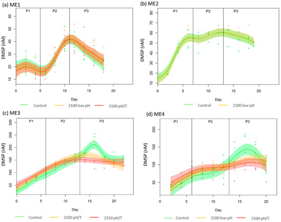 GAMMs plot of DMSP concentrations (in nmol L−1) during (a) ME1, (b) ME2, (c) ME3, and (d) ME4, in each treatment against time. The bold line represents the average for each treatment or control of the data points and the shaded area represents 2 standard errors. Note differences in vertical scales.