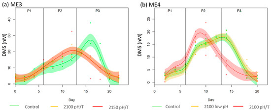 GAMMs plot of DMS concentrations (in nmol L−1) during (a) ME3, and (b) ME4 against time. The bold line represents the average of the treatment’s duplicates, the points are the actual measurements and the clearer area around the average represents the deviation. Note the differences in vertical scales.