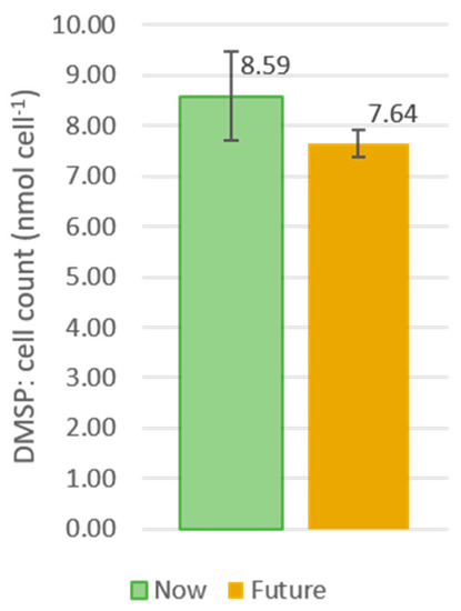 The significant growth response of Cylindrotheca closterium during ME3 prompted further study of this species’ response to future conditions in uni-algal incubations, with DMSP cell concentration measured to determine whether there was a treatment effect on the production of DMSP. For the “Now” conditions, the cellular DMSP content was 8.59 ± 0.87 nmol cell−1 (mean ± standard deviation) compared to 7.64 ± 0.27 nmol cell−1 (mean ± standard deviation) under “Future” conditions (Figure 4). These are higher concentrations than the 2.28 nmol cell−1 reported for this species by Keller et al. [46], although the total DMSP (DMS + DMSP particulate + DMSP dissolved) is reported in the current study. Consequently, there was no significant treatment effect on the production of DMSP when comparing “Now” and “Future” conditions (t = 1.8085; df = 2.3889; p-value = 0.19).