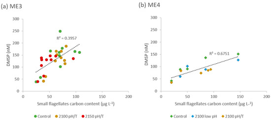 Relationship between DMSP concentration (in nmol L−1) and small flagellates’ carbon content (in µg L−1) in the different treatments of (a) ME3 and (b) ME4.
