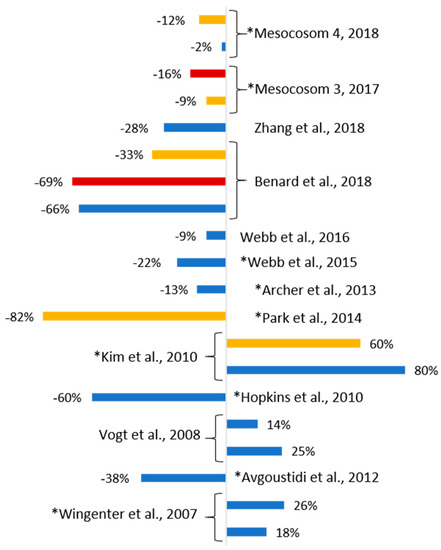 Figure 6 presents a comparison of the results of this study with other published mesocosm studies that have examined the effect of ocean acidification and warming on DMS production (see Figure 6’s legend for attribution). These were carried out in different coastal waters at Northern hemisphere sites (Norwegian fjords, Korea, Baltic sea) with different initial conditions at different times of the year. In addition, they cover a broad pH range (from 8.3 to 7.2) and some include nutrient addition. For each reported study the difference in total DMS concentration, integrated over the full duration of each experiment, between the control and the most extreme future scenario is presented. The decrease in DMS production in New Zealand coastal waters is relatively low compared to other coastal regions, although this comparison is influenced by differences in biomass and community composition between studies. The seasonal Evans Bay pH range is between 7.85 to 8.10 [56] and its minimum pH is not significantly different from the experiments’ targeted pH. However, although coastal phytoplankton experience this pH range over the year [57], the experiments were primarily carried out during spring when Evans Bay’s pH is usually >8.0, and so the phytoplankton community at this time would not experience the low pH tested in the experiments. In contrast to the current study, most studies report a significant decrease in DMS concentration with OA, with only Vogt et al. and Wingenter et al. [17,30] showing an increase in DMS production under low pH, which they attribute to increased bacterial and viral activity. In the combined low pH & elevated temperature treatment of Kim et al. [31] significant production of DMS relative to the control was attributed to micro-zooplankton grazing on high DMSP phytoplankton species which were more abundant in their treatments. Consequently, although the observed response in DMS is not consistent with this study, the underlying driver of phytoplankton community structure is a primary factor. In other experiments where warmer temperatures were combined with lower pH the DMS yield is lower, consistent with the results presented here [19,23]. A strong correlation was observed between DMS production and grazing by Park et al. [19] but did not result in a DMS increase. The results from Park et al. and Kim et al. [19,31] highlight how the biological communities (phytoplanktonic and micro-grazers) and processes influence DMSP and DMS concentrations.