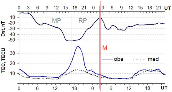 Variations of Dst-index (upper panel) and vTEC (lower panel) during 18–19 February 2020. Observed vTEC (blue curve); vTEC median by 27 previous days (black dotted curve).