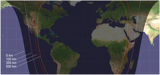 If a meteoroid passage and explosion occurs at sunrise or sunset, the passage of the solar terminator should be taken into account as it can be one of GW sources and also cause some disturbances in the ionosphere observed in sTEC variations [7,19]. Our meteoroid fell in the evening hours. Figure 2 shows the terminator position at different heights: 0 km (ground), 100 km (E-layer), 350 and 500 km (F2-layer). The blue dot in the center of Mexico is the site of the meteoroid explosion. Usually, major impact on GPS signal scintillations is produced in the ionospheric F region at ~350 km (±100 km). Although Mexico was already at the night side of the Earth, the terminator passed recently these heights over the site of the explosion (between 01:50 and 02:13 UT (5–28 min before the meteoroid)).