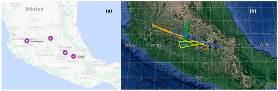 No data from regional all-sky cameras or other optical instruments were available for the moment of the meteoroid passage. There are methods of meteoroid trajectory determination based on data of multiple cameras, for instance [20,21]. We searched for videos by outdoor surveillance cameras which captured the meteor from different places. Four videos from the “Webcams de México” network of outdoor cameras (www.webcamsdemexico.com) were found (Appendix B). They were taken in (a) Puebla, (b) Mexico City, (c) Guadalajara and (d) San Miguel de Allende (Figure 3a). Thus, the meteor trajectory captured from four different locations was available for the analysis.