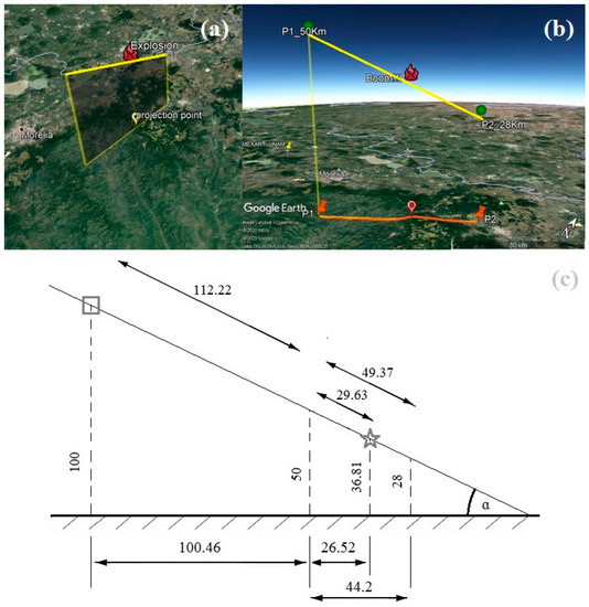 (a,b) Illustration by Google Earth; (c) scheme of calculated meteoroid/meteor trajectory and its projection on the ground (approximate distances are indicated in km).