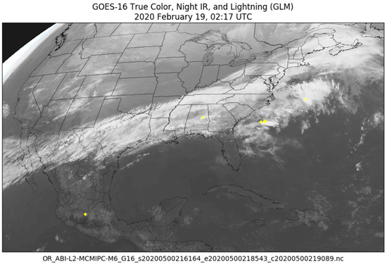 - Bruning, E.; Tillier, C.E.; Edgington, S.F.; Rudlosky, S.D.; Zajic, J.; Gravelle, C.; Foster, M.; Calhoun, K.M.; Campbell, P.A.; Stano, G.T.; et al. Meteorological imagery for the geostationary lightning mapper. J. Geophys. Res. Atmos. 2019, 124, 14258–14309. [Google Scholar] [CrossRef]