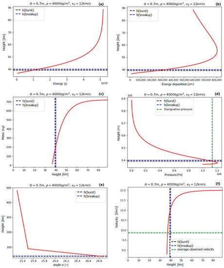Reconstruction of the Morelian meteoroid passage: (a) total energy change with altitude; (b) energy deposition, (c) mass loss and (d) pressure change with altitude; (e) α estimation; (f) velocity loss with altitude. Blue and black dotted lines indicate modeled break-up and burst heights.