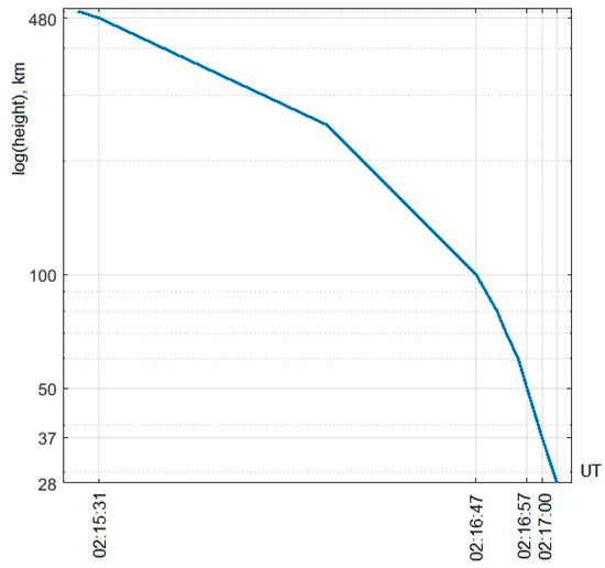 Knowing the meteoroid’s velocity and time when it was at h1, and using the results of Figure 6e,f, it was possible to estimate the approximate time when it was at other heights including 480 km, 250 km (F region) and 100 km (E region). For this matter, the oblique path traversed by the meteoroid was calculated (analogously to Figure 4c) for each part of the trajectory characterized by different υ and α. This gave us the reconstructed trajectory of the object: coordinates of the path projection points corresponding to each altitude above the ground against time. Figure 7 illustrates the results. Therefore, we can associate the time and coordinates of the ionospheric response to the time and coordinates of the meteoroid event (entry, flight, explosion).