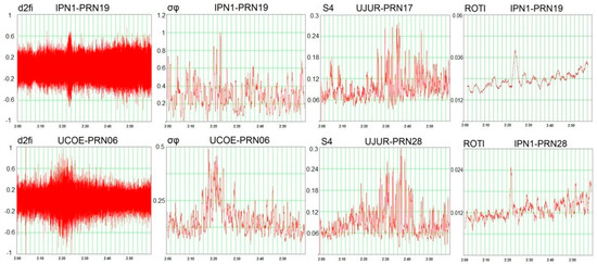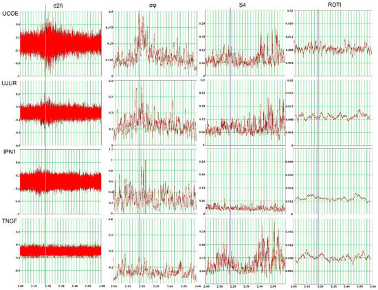 Figure 10 illustrates four scintillation indices behavior during 02–03 UT at LoSs between all the receivers and PRN02 calculated with L1 data. The same plots were constructed for other satellites (not shown for the economy of space; see Appendix C). Table 3 summarizes the overall picture of disturbance manifestations by different indices at different satellite-receiver rays. Columns from left to right are in order from the closest to the farthest to the meteoroid trajectory LoS with respect to UCOE. The sign “+” means an intense index response; “+/-” means a low intensity of manifestation; “^” means that a manifestation was delayed if compared to other indices at the same PRN; and “-“ means no index peak. The characteristic examples of index bursts are given in Figure 11.