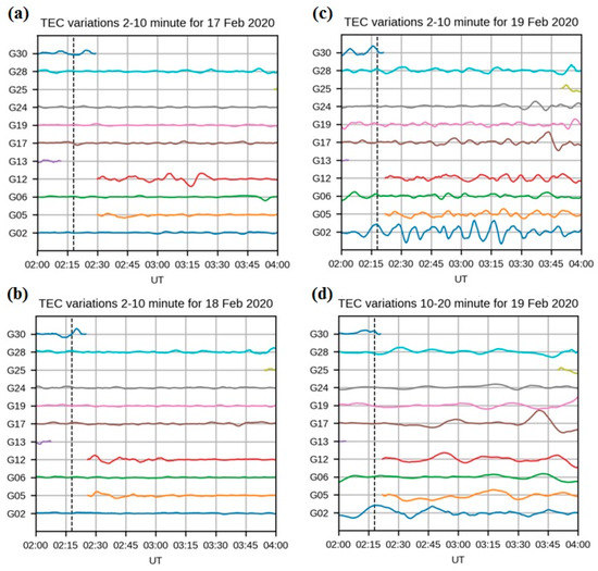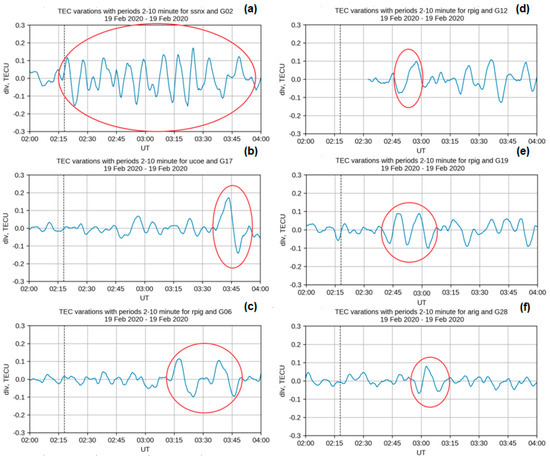 For the “classical” approach, the lower resolution data can be used. Such data were available from the eleven stations (Table 2, Figure 8b). Their data were processed with the SIMURG tools [44]. First, sTEC was calculated along the receiver–satellite line-of-sight (LoS) based on dual-frequency phase measurements. Further, sTEC series were detrended with splines and then filtered with the centered moving average with 2 and 10 min windows (2–10 min TEC variations). Finally, sTEC variations were converted to equivalent vertical variations (dIv). The same was done with 10 and 20 min windows (10–20 min TEC variations). Please see more details on the method in [44] and references therein.