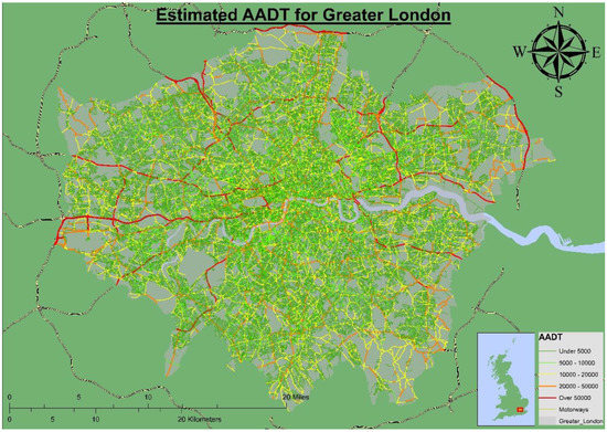 In Figure 2 the estimated AADT for all street segments in the Greater London area are presented, where roads with significantly higher traffic volumes can be distinguished. These are usually ‘A’ roads and parts of motorways. Roads around Heathrow airport, river crossings and major arteries also appear to carry heavy traffic loads, while secondary roads and streets in residential areas have lower AADT values.