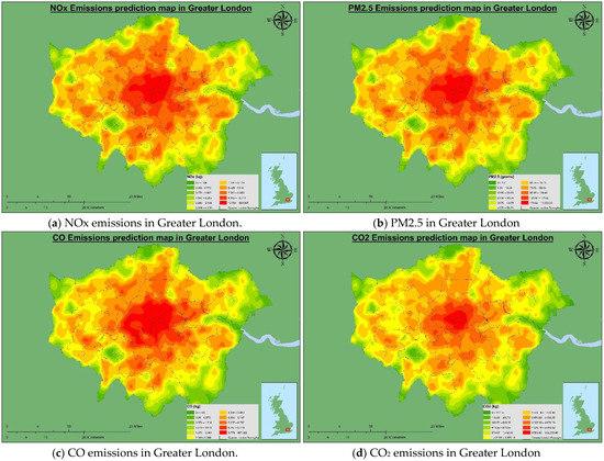 In Figure 3 emissions for the estimated pollutants and CO2 are shown with London boroughs overlaid with heat maps for each pollutant and CO2. Higher pollution can be observed in central and inner London as opposed to boroughs located far from the city centre. South London boroughs have lower level emissions compared to the north part of the city, reflecting the lower levels of traffic shown in Figure 2.