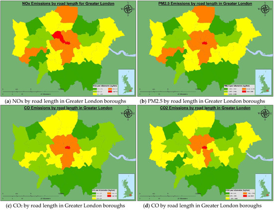 Similar patterns are observed in Figure 4 where emissions for each borough are mapped by the length of streets within the borough—kilograms of pollutant per kilometre of street length (kg/km). One can observe that some boroughs in the northern part of the city have higher values of emissions, particularly in the case of NOx and PM2.5.