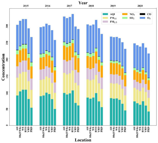 In recent years, pollution concentrations and AQI in China have decreased annually, and there are obvious temporal and spatial characteristics of low concentrations in the south and high concentrations in the north. Air pollutants undergo significant changes under the influence of climatic conditions and human activities. Average air pollution and air quality values during the study period of 2015–2020 (Figure 1) indicate that air pollution levels have declined annually in Beijing, Tianjin, Hebei, the Yangtze River Delta, the Pearl River Delta, and Hubei and its surrounding provinces. The highest (lowest) average AQI concentrations in the six regions during this period were: 106.50 (52.99), 97.78 (49.18), 104.29 (59.51), 96.48 (54.52), 81.27 (44.71), and 72.21 (41.64) μg·m−3, respectively. In addition, highest average concentrations of AQI were recorded numerous times during the last five years in northern China (Wuhan and Beijing); the Pearl River Delta recorded the lowest value area, reflecting the spatial characteristics of China’s air pollution, with high values in the north and low values in the south.