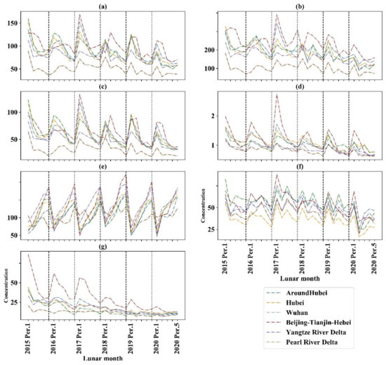 According to the Chinese lunar month division time period, the monthly average concentration data are shown for AQI (a), PM10 (b), PM2.5 (c), CO (d), O3 (e), NO2 (f) and SO2 (g) for the five study periods from 2015 to 2020, in Beijing, Tianjin, Hebei, Yangtze River Delta, Pearl River Delta, and Hubei and surrounding provinces (Same unit as Figure 1). Dotted lines separate the periods of successive years.