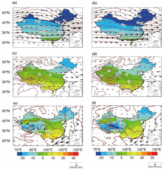 Distribution of circulation: (a,c,e) 2017 on Period 2, (b,d,f) 2020 on Period 2. Circulation at 500 hPa (a,b), geopotential height (contours; m), air temperature (shaded; °C) and wind (vectors; m/s). Relative humidity at 750 hPa (c,d), distribution of sea level pressure (e,f), pressure (contours; hPa), air temperature (shaded; °C), and wind (vectors; m/s).