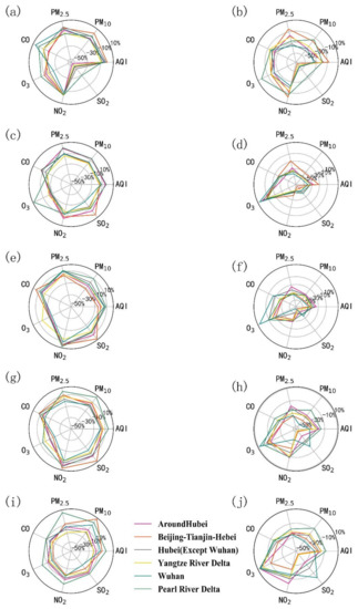 The percentage change of the monthly average of AQI from Period 1 2019 to Periods 2–5 2017 (a,c,e,g,i) and 2020 (b,d,f,h,j) compared to the 5-year average for the same period of 2015–2020. A positive value indicates an increase in percentage, and a negative value shows the opposite.