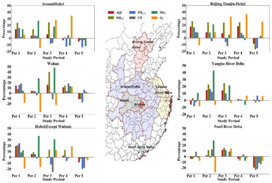 The trend of atmospheric particulate pollutants was similar to that of AQI, with the degree of pollution decreasing annually. In 2020, atmospheric particulate pollutants fell in Beijing-Tianjin-Hebei, Pearl River Delta, Yangtze River Delta, and Hubei and its surrounding areas, and PM10 concentrations decreased by 33.58–50.55% in Period 2. PM2.5 concentrations experienced the highest decrease in Wuhan (42.07%). Although the reduction of atmospheric particulate matter in various regions in Period 3 was significantly smaller than that in Period 2, the declines in PM10 in Periods 3 and 4 in Wuhan were 44.55% and 46.04% respectively. In Period 5, the decline of particulate pollutants in the various regions gradually reduced.