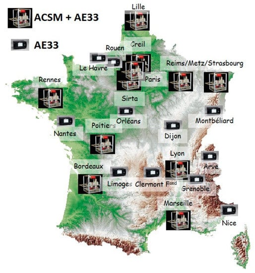 The current distribution of sites equipped with both ACSM and AE33 devices offers a relatively dense covering of the French metropolitan area. Considering the investment costs associated with ACSM equipment, and that it measures species, displaying rather homogeneous background concentration at a regional scale, this ACSM network nowadays offers a very close-to-optimum number of sites. In contrast to ACSM, AE33 measures primary species, which can have a larger spatial heterogeneity, so that additional urban areas can be equipped with AE33 only (Table A1 and Figure 1).