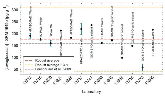 Levoglucosan is known as a tracer for biomass burning aerosols [58], and has been widely used to estimate the concentration of organic matter related to this emission source by applying a multiplicative conversion factor [59]. Its accurate quantification is then critical to avoid significant bias when using such a mono-tracer method. In this context, LCSQA and IGE organized an ILC dedicated to the measurement of this compound and its isomers (mannosan and galactosan), including results obtained by 13 European research laboratories [60]. The main purpose of this ILC was to evaluate the analytical repeatability and reproducibility standard deviations obtained by the participants using their own analytical method. Four test materials were sent to the participants, including two ambient air filter samples (corresponding to high winter range concentrations), one laboratory blank filter, and one certified reference material (SRM 1649b, urban dust, National Institute of Standards and Technology (NIST)). Most of the participants obtained satisfactory Z-scores (−2 < Z-score < +2). Furthermore, the analytical procedure used by participants appeared to have no significant influence on the quantification of levoglucosan and its isomers, and relatively low expanded uncertainties could then be calculated (e.g., 35–52% for levoglucosan). Results from this ILC also provided a robust concentration value of levoglucosan (177.0 µg g−1 with 52% expanded uncertainty) and its isomers for the SRM 1649b (Figure 2), consistent with previous values available in the literature (e.g., [61]). Finally, the use of cost-effective amperometry-based methodologies, which were developed in the early 2010s, and could be validated for application within the CARA program.