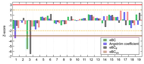 Figure 3 presents the Z-scores obtained for each instrument for the following parameters: eBC, eBCff, and eBCwb concentrations, as well as the measured Angström exponent (α). Only two instruments (among the first ones to be produced by the manufacturer) presented a Z-score requiring corrective action (i.e., shipment to the manufacturer for maintenance and upgrade), confirming the good general behavior of the vast majority of AE33 devices used within the CARA program. A very good agreement between other instruments could indeed be observed for each investigated parameter. In particular, and despite the light influence of biomass combustion on eBC levels (less than 10%, on average over the campaign), a satisfactory overall agreement was obtained for the eBCwb concentrations related to this source.
