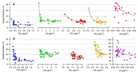 Figure 4 reports, for each measured chemical species, the evolution of the standard deviations obtained from the eight instruments as a function of the mean concentration, before and after calibrations. First, we note that these standard deviations exponentially decrease with concentrations, clearly illustrating higher uncertainties at lower loadings, for each chemical species. Nevertheless, these standard deviations reach an asymptotic plateau, relatively, rapidly towards the lowest standard deviation values, pointing to reproducibility measurement uncertainties below 20% for nitrate, sulfate, and ammonium loadings typically higher than 0.5 µg/m3, and for OA concentrations typically higher than 1.5 µg/m3. Similar decreasing features are also observed for chloride, with, however, much higher dispersion of the data points, due to extremely low concentrations (below 0.1 µg/m3). Finally, these ACSM measurement standard deviations are only slightly improved after calibrations and tunings, illustrating the overall good performance of the ACSM at their respective measurement stations before the ILC exercise.