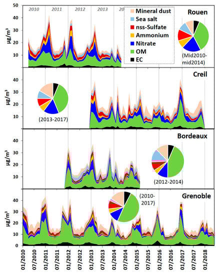 Figure 5 summarizes the longest (semi-)continuous datasets that could be obtained so far from offline chemical analyses of the main PM10 components within the program. Based on monthly-mean concentrations, it exemplifies long-term variations of these components at four French urban background environments, for which every day (Rouen), every second day (Bordeaux), or every third day (Grenoble and Creil) filter samples were analyzed routinely during the last decade.