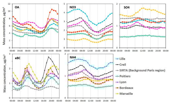 For inorganics, very similar profiles are obtained for both ammonium and nitrate, illustrating the overall predominance of ammonium nitrate over ammonium sulfate in French urban atmospheres. Due to its semi-volatile nature, ammonium nitrate is very much dependent on the meteorological conditions, with a peak in the late-night/early-morning before the daytime temperature and boundary layer heights increase, leading to reduced particulate phase concentrations. Interestingly, the profiles exhibit a decreasing gradient from north to south and east to west, with Lille showing the highest concentrations and Marseille the lowest ones (Figure 6).