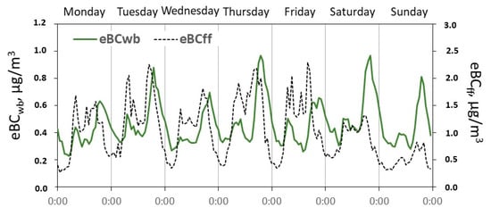 Mean weekly diel variations of eBCwb and eBCff concentrations at the Poitiers urban background station during the winter season (2017–2018).