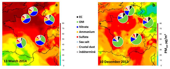Examples of daily PM10 chemical composition observed for five urban stations (Lens, Rouen, Strasbourg, Lyon, and Bordeaux) during two different types of pollution episodes, along with PM10 concentration mapped using the Prev’Air modeling system (http://www2.prevair.org) analyzed with in situ PM10 measurements. (a) 13 March 2014, (b) 10 December 2013