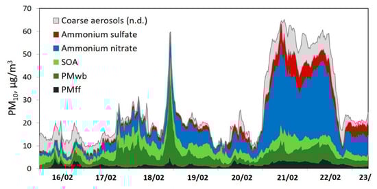 As discussed in Section 3.1, highest monthly-mean PM concentrations are quasi-systematically observed during a period covering winter and early spring. Logically, this period of the year also corresponds to the predominant occurrences of persistent and large-scale pollution episodes (i.e., with PM10 daily concentrations above 50 µg/m3 for at least three consecutive days, affecting several administrative regions at the same time). The chemistry of such PM pollution episodes is highly dependent on meteorological conditions and on the type of emission sources, which prevail while they occur. Figure 8 presents two contrasted examples of such episodes, clearly illustrating their diversity.