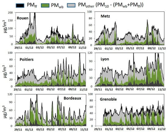 Figure 8b exemplifies a fully different type of PM pollution episodes, which can develop in wintertime under anticyclonic regime associated with stable and cold weather conditions. Such meteorological conditions favor the accumulation of pollutants at a local scale, trapping them in very thin inversion layers. This results in pollution maps presenting a heterogeneous spatial distribution of PM concentration levels, with highest loadings at the vicinity of prevalent emission zones, i.e., urban areas. Since happening during cold periods, such pollution episodes are concomitant with a greater use of domestic heating, especially residential wood burning. During these events, the PM chemical composition is then dominated by carbonaceous matter, with OM-to-PM10 contributions as high as 70–80% in some cases (e.g., Bordeaux in Figure 8b). This impressive burden of (primary) carbonaceous aerosols is further assessed as mainly being influenced by domestic human activities. Figure 10 illustrates monitoring data that could be obtained in near-real time by AASQAs using PM10 and multi-wavelength absorption measurements at different urban background stations during such an early-winter pollution episode, which occurred in December 2016. Due to the temporality of residential heating emissions, highest PMwb relative contributions, as well as highest PM10 loadings, are generally recorded at nighttime.