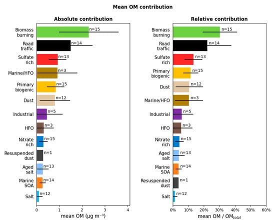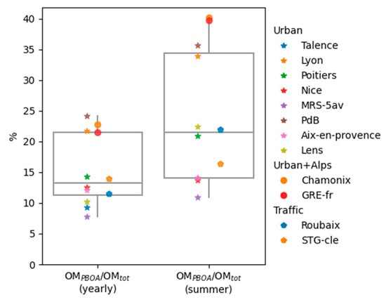OM appears as the predominant component at all sites, with typical PM10 relative contributions of 40–45% on a yearly basis. It is also the main driver of PM temporal variations, displaying a clear seasonality with maxima during the winter season. These observations reflect the diversity and the significance of the various OM origins, including a large zoo of primary (natural and anthropogenic) emission sources, but also multiple secondary formation processes in the atmosphere (again from both biogenic and anthropogenic gaseous precursors) [39]. Winter maxima can be partly explained by generally lower planetary boundary layer height at low ambient air temperatures, concentrating all pollutants in a narrow mixing layer. This feature is also related to additional primary sources compared to the rest of the year, especially residential wood burning for heating purposes (Section 5). A first insight into the strong influence of this specific source is given by the highest wintertime OM relative contribution in Grenoble compared to the three other sites presented in Figure 5, as well as the highest wintertime OC and levoglucosan absolute concentrations recorded for the different Alpine sites, compared to other French sites (Appendix B). Moreover, Bordeaux surprisingly reveals biomass burning influences almost as important as those observed for Alpine sites, e.g., with similar levoglucosan loadings, which has been confirmed by comprehensive studies [42,54,63]. Other major contributors to OM include vehicular exhaust emissions (Section 6), primary biogenic particles (Section 7), and SOA (Section 12).