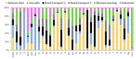 For further investigation of the PM sources, receptor models are nowadays widely used in atmospheric sciences. In particular, a growing number of studies have been applying positive matrix factorization (PMF, [37]) to chemically speciated datasets over the last decade (e.g., [38,39,40]). PMF is a multivariate tool that makes use of measured concentrations and their uncertainties to solve the mass balance equation X = G × F + E, where X corresponds to the input data matrix, F represents a matrix whose vectors stand for the profiles of a p number of factors (that might eventually be attributed to specific emission sources or secondary aerosol types), G corresponds to the contributions of the p sources to total PM, and E represents the residual matrix. Detailed and practical descriptions of the way PMF has been used in the frame of the CARA program, and this program, participate in the development of receptor models, and can be found elsewhere [18,36,41,42,43]. All of the PMF results presented in this paper were obtained using the most recent US EPA PMF v5.0 software and following recommendations of the EU guidance document [44].
