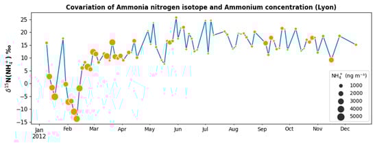 Nitrate can be considered as the main second driver of PM10 seasonal cycles, with highest concentrations and relative contributions in late-winter/early-spring, especially in the northern part of France (Figure 5 and Appendix B). This is related to the formation mechanisms and the semi-volatile nature of ammonium nitrate. Indeed, this secondary species results from the oxidation of nitrogen oxides (NOx) and byproduct combination and/or condensation with ammonia (NH3) in the particulate phase [67]. Its concentration in ambient air is therefore notably dependent on the availability of its gaseous precursors and on the strength of (photo-)chemical atmospheric processes. In late-winter/early-spring, intense agricultural activities, including the spreading of fertilizers, under anticyclonic conditions, induce a substantial increase of nitrate and ammonium concentrations within the PM2.5 fraction (Section 10). Such a phenomenon furthermore relies on the meteorological conditions as ammonium nitrate is submitted to partitioning between the gaseous and the particulate phases as a function of ambient temperature, hygroscopicity, and internal mixing with other compounds [67], which also partly explains the spatial and seasonal nitrate distributions illustrated in this paper.