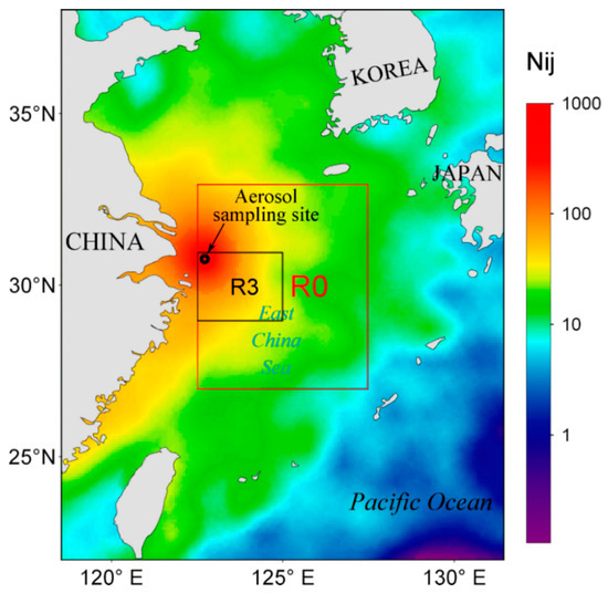 The studied oceanic regions were selected considering the multiple influencing factors including Changjiang River runoff, upwells in coastal areas, and the forward air trajectories from Huaniao Island (aerosol sampling site). 72 h forward trajectories at 700 m starting height during the springs of 2011–2015 were calculated by running the NOAA Air Resource Lab HYSPLIT model and the TrajStat Software [50,51]. Nij value is used as the number of trajectory segment endpoints falling into each statistical grid cell (0.5° latitude × 0.5° longitude) [52]. To identify the influence of atmospheric deposition, a 2° × 2.5° (latitude 29–31° N and longitude 122.5–125° E) area (generally with Nij values greater than 30) located in the southeast to Huaniao Island was selected as the studied area (R3), and a 6° × 5° area (R0, 27–33° N and 122.5–127.5° E, generally with Nij values greater than 10) covering the southern YS and the majority of the ECS (Figure 2) was used to compare with R3 in the statistical analysis.