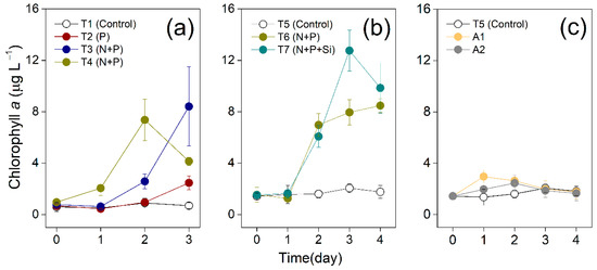 The initial Chl a concentrations in seawater collected for 2012 and 2014 bioassay experiments were 0.61 and 1.44 μg L−1 respectively, which were comparable to those (0.27–1.37 μg L−1) measured previously in the surface ECS [53]. The initial concentrations of NH4+, NO3−, SP, and SiO32− in the seawater collected for 2012 experiment (Figure 1) were comparable to the nutrients previously reported (0.2–4.8 μmol L−1 NO3− and 0.1–0.4 μmol L−1 SP) in the same area of the ECS [53,54]. The N and Si concentrations were higher than 2 μmol L−1 and the P concentrations were lower than 0.2 μmol L−1 which represent approximate half-saturation constants for uptake and potentially limit algal growth [55]. The N/P ratio, Si/P ratio were 44.2, 23.1 in 2012 seawater and 45.8, 115.7 in 2014 seawater, respectively, higher than the criteria for P limitation (N/P > 22, Si/P > 22) proposed by Justić et al. [56]. A remarkable increase of Chl a (156% of the control) was observed in P treatment (T2, Figure 3a) but not with the addition of only DIN (Figure S3a from a microcosm experiment), suggesting that P was likely a prior limiting factor for phytoplankton growth in the sampled seawater. Moreover, the maximal Chl a concentrations were considerably higher in N + P treatments (8.41, 7.37 and 8.48 μg L−1 for T3, T4 and T6, respectively, Figure 3b) compared to T2 (2.47 μg L−1), implying that initial N concentration (2.91–5.35 μmol L−1) in seawater may not be sufficient to support the phytoplankton growth induced by 0.6 μmol L−1 P addition and PN co-limiting seemed to occur. Our observation of maximal Chl a (8.41 μg L−1) in all N + P treatments was comparable to the highest value (9.1 μg L−1) reported in this area in spring [57], suggesting that the amounts of N and P added in the bioassay experiments were in a reasonable range compared with the actual nutrient inputs.