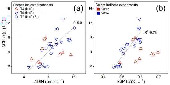 Change of Chlorophyll a (ΔChl a) concentrations versus (a) DIN consumption (ΔDIN) and (b) phosphate consumption (ΔSP), calculated using the initial DIN or SP concentrations (including additions and seawater background) minus their concentrations at the sampling day.