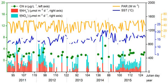 The averaged Chl a concentrations in R3 usually peak in the spring (Figure S2). To better identify the influence of atmospheric N deposition on the primary production in the ECS and diminish the influence of factors with seasonal variation, such as nutrient supply from the Yangtze River or upwelling, we combined field measurements of daily aerosol components over Huaniao Island during springtime from 2011 to 2015 with MODIS/Aqua standard level 3 Chl a, PAR and SST in the same periods. The daily Chl a corresponding to aerosol sampling days range between 0.66 and 5.09 μg L−1 in the studied period of 2011–2015 (Figure 5). The mass concentrations of NO3− and NH4+ in the samples collected in the same period over Huaniao Island ranged between 0.3–37.1 μg m−3 and between 0.02–9.2 μg m−3, respectively, The calculated deposition velocities for NO3− and NH4+ were 1.5 and 1.2 cm s−1 [26] respectively, and therefore the dry deposition fluxes of NO3− and NH4+ ranged between 6.7–775 μmol m−2 d−1 and between 1.1–531 μmol m−2 d−1, with the averages (medians) of 174 (150) and 158 (136) μmol m−2 d−1, respectively (Figure 5). The variations of atmospheric concentrations of soluble P, Fe, and Cu were provided in Table S2.