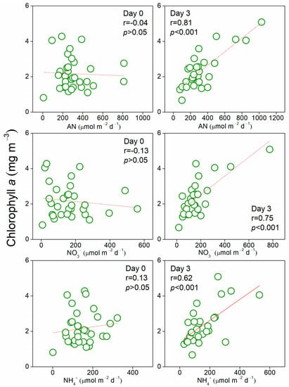 Correlations between Chl a and atmospheric dry deposition fluxes of nitrogen species in R3 on day 0 and day 3. AN is calculated as the sum of NH4+ and NO3−.