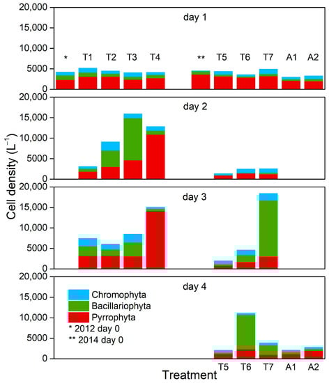 Algal species belonging to three phyla Pyrrophyta (dinoflagellates), Bacillariophyta (diatoms), and Chromophyta were recorded using microscope during the bioassay experiments. It was found that the initial seawater sampled in 2012 and 2014 contained 49 and 86 algal species with total cell densities 4201 and 4515 cell L−1, respectively (detailed in Figure S8). Dinoflagellates were dominant species in the initial seawater for both 2012 (56.8%) and 2014 (81.4%) experiments, which probably corresponded to the high N/P ratio (~50) and P-limiting condition (Si/P > 22 and N/P > 22) of the seawater [11]. It was suggested that with natural algal assemblage, dinoflagellates had higher affinity to P and were more adaptable to high N/P ratio than diatoms (few exceptions may be related to their life cycle properties) [12,74]. The initial SiO32− concentrations in both experiments (2.77 and 6.94 μmol L−1) were not the limiting factor (above threshold concentration of ~2 μmol L−1) for the diatoms.
