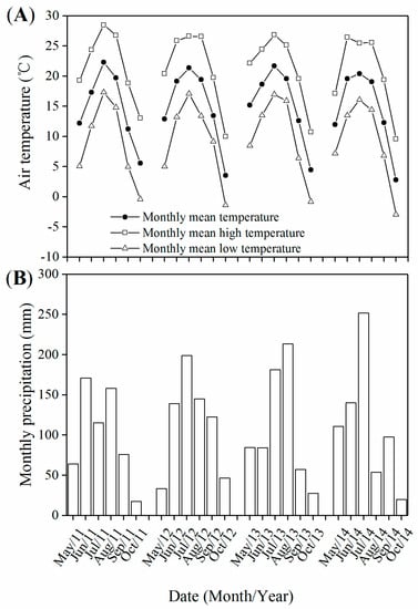 Monthly air temperature (A) and precipitation (B) from May to October 2011–2014.