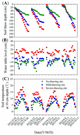 Three peatlands with no-thawing, mild-thawing, and severe-thawing permafrost conditions were selected in this study. The depths of the soil active layers were 60–90 cm (no-thawing), 110–140 cm (mild-thawing), and 140–170 cm (severe-thawing) during the years 2011–2014.