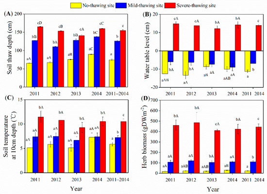 Differences in soil thaw depth (A), water table level (B), soil temperature (C) and herb biomass (D) among sampling years and sites. Data are means ± SE. For water table level and soil temperature, n = 18 in 2011, n = 16 in 2012, and n = 17 in 2013 and 2014. For soil thaw depth, n = 10 in each year. For herb biomass, n = 3 in each year. Different lowercase letters indicate the significant differences among sites in the same year or the mean of the four years. Different capital letters indicate the significant differences in the same site between different years.