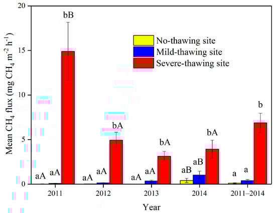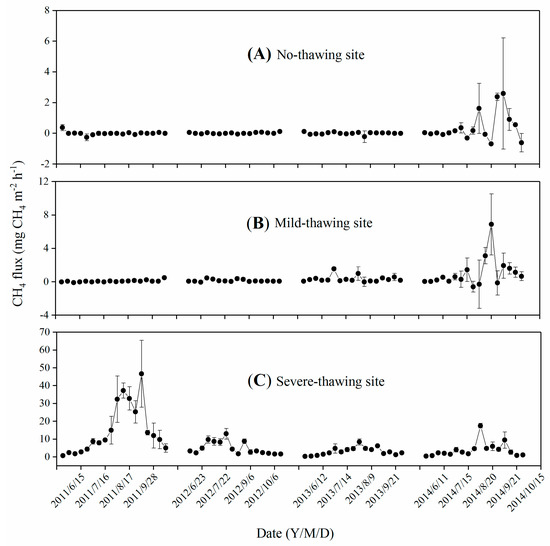 Mean CH4 fluxes over the four growing seasons were 0.12 ± 0.06 mg CH4 m−2 h−1, 0.38 ± 0.12 mg CH4 m−2 h−1 and 6.58 ± 1.09 mg CH4 m−2 h−1 in the no-thawing, mild-thawing, and severe-thawing sites, respectively (Figure 5). The mean CH4 fluxes from the severe-thawing site were always significantly higher than from the mild-thawing and no-thawing sites (p < 0.001). However, no significant difference was found between mild- and no-thawing sites (p > 0.05).