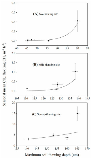Relationship between seasonal mean CH4 flux and annual maximum soil thawing depth in no-thawing (A), mild-thawing (B) and severe-thawing (C) sites.