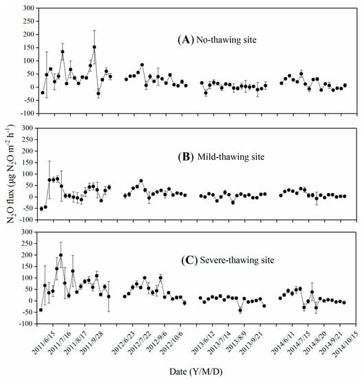 Obvious seasonal variations of N2O fluxes were observed in all four growing seasons, except in the no-thawing and severe-thawing sites in 2013 and in the mild-thawing site in 2013 and 2014. High N2O flux peaks with no more than 200 μg m−2 h−1 appeared in 2011 in all the three study sites, and those with low N2O flux peaks of about 20 μg m−2 h−1 appeared in 2013 (Figure 7). Flux peaks could appear in any month from June to September, and more than two peaks were observed at most sites and in most years. N2O absorptions were observed in all three study sites under different permafrost thawing conditions. The rates ranged from −24.1 to 151.8 μg N2O m−2 h−1, from −51.7 to 78.7 μg N2O m−2 h−1, and from −41.1 to 199.9 μg N2O m−2 h−1 in the no-thawing, mild-thawing, and severe-thawing sites, respectively (Figure 7). N2O fluxes were always low in years with little seasonal variations.