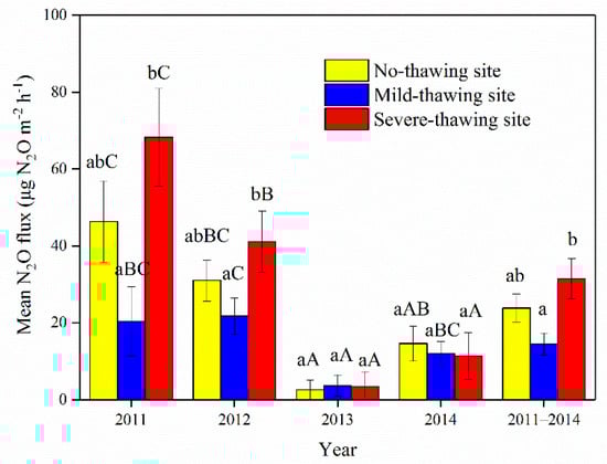 Mean N2O fluxes from the no-thawing site were significantly higher in 2011 than 2013 and 2014 (Figure 8, p > 0.05). Mean N2O fluxes from the mild-thawing site were significantly higher in 2012 than 2013 (p < 0.05), and both years were not significantly different from 2011 and 2014 (Figure 8, p > 0.05). In the severe-thawing site, the highest N2O fluxes happened in 2011 (Figure 8, p < 0.05).