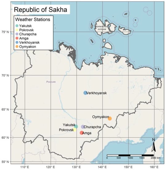 The Republic of Sakha, also known as Yakutia (Figure 1) is considered one of the coldest populated regions of the world, with very low temperatures in winter reaching −50 °C and lower. The towns Oymyakon and Verkhoyansk (Figure 1) are the coldest inhabited places on earth, with minimum recorded temperatures below −67 °C []. However, in recent years there has been a rise in the average annual temperature, which is currently registered everywhere in the world and in Russia. So, in regions of the Republic, temperatures of −60 °C and lower are becoming rarer, and in the central areas in winter-time, temperatures of −50 °C and lower are also becoming less common. Along with this, abnormally high temperatures in the summer period are often recorded, which are not usual for this region, reaching the level of 34 °C and higher, as well as the recording of changes in the average monthly temperature in the off-season periods [].