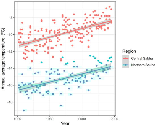 During the considered period of observations from 1961 to 2018, we observed a significant positive upward trend in annual average temperatures at the weather stations in both central and northern Sakha (Figure 2). The temperature increased on average by 0.058 °C per year at the central stations, and 0.049 °C per year at the northern stations.